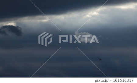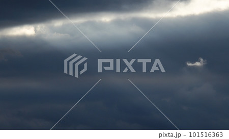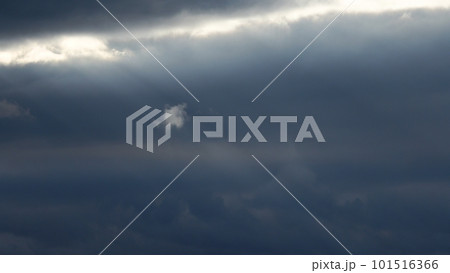 風が強かった夕方に雲間から射した光芒と光線に照らされた雲・春・望遠・空のみ・230318pm