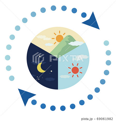 朝昼夜 24時間のイメージイラスト(青色ドット矢印)