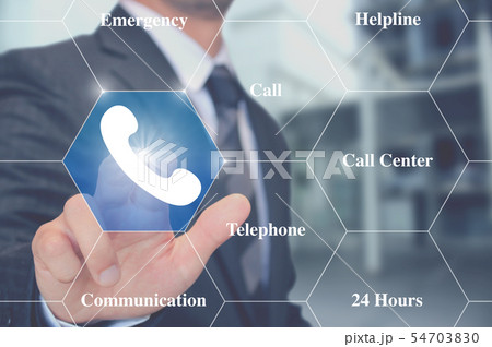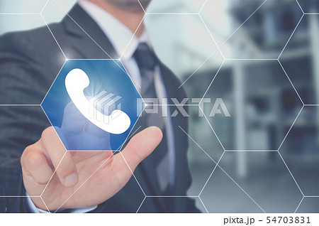 電話受話器のマークを触るビジネスマン Businessman touching telephone