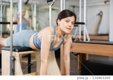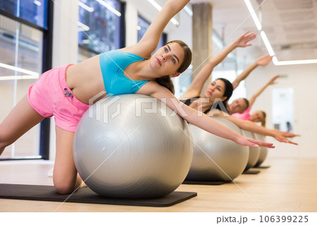 Sporty young woman performs an exercise, squeezing an isotonic ring between her hands