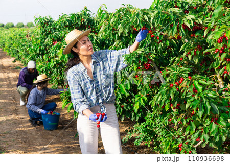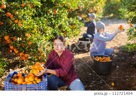 Three farmers pluck tangerines from trees and put the harvest in buckets and crates