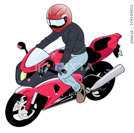 赤い大型バイクを運転する人のイラスト【ライダー・ヘルメット・オートバイ・単車・二輪・レッド・走行】