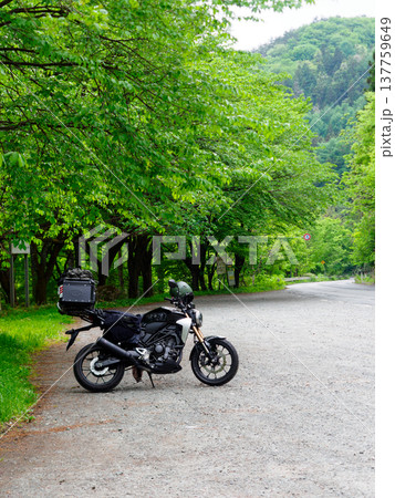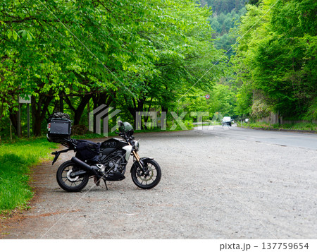 初夏の道端にバイク