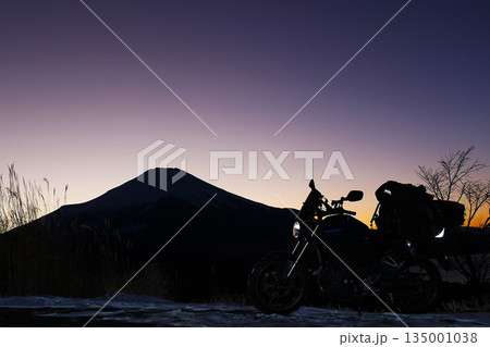 山中湖明神山パノラマ台から望む富士山とバイクの夕景