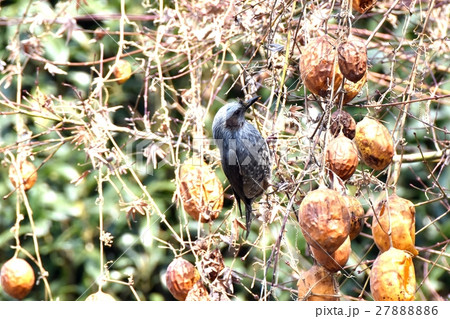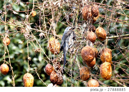 東京都三鷹市の野鳥、仙川に隣接する公園内のセンダンの実を咥えるヒヨドリ