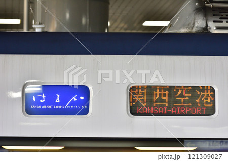 大阪府、関西空港駅のプラットホームと停車中の関空特急はるか