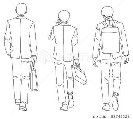 ビジネスマン3人組の後ろ姿のイラスト モノクロ線画