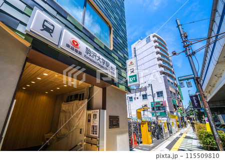 日本の東京都市景観 6月。東急電鉄 駒沢大学駅 駒沢公園口などを望む。画面左奥に東口