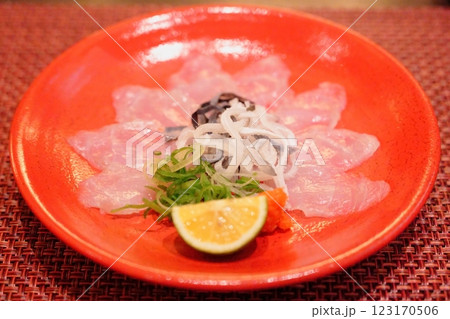 赤い皿に並べられた3年トラフグのてっさ一人前と上に乗せられたてっぴ