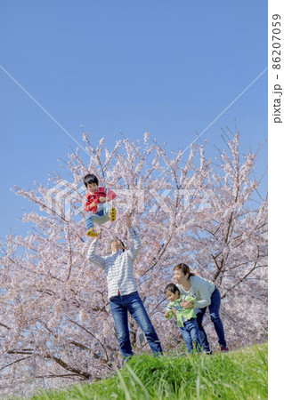 桜の咲く土手で遊ぶ4人家族