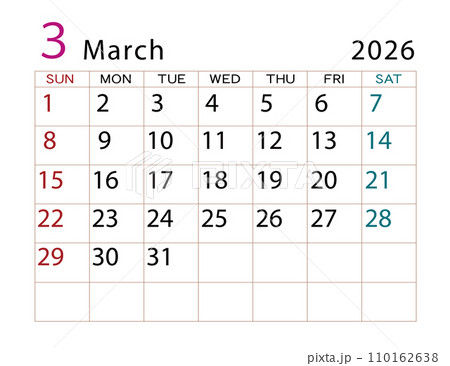 シンプルなデザインの2026年3月のマンスリーカレンダー素材
