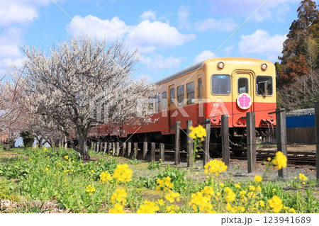 小湊鐵道「梅の花と菜の花咲く沿線風景を走る列車」