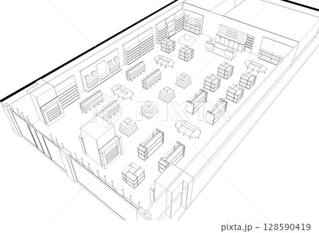 shopping mall, contour visualization, 3D illustration, sketch, outline
