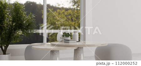 A marble coffee table, poufs, and a houseplant near by the window in a modern white living room.