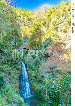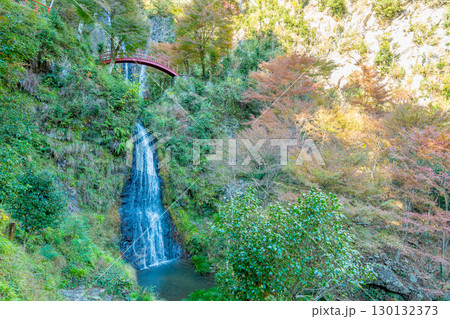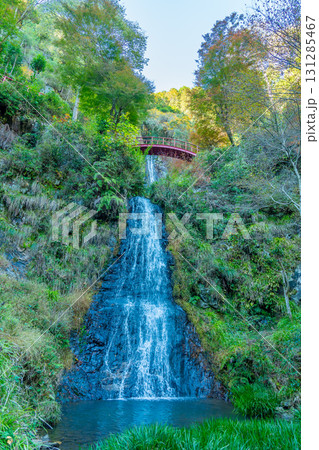 岐阜県八百津町 剣豪宮本武蔵が修行したと言われる伝説がある秋の五宝滝の赤い橋を渡る人