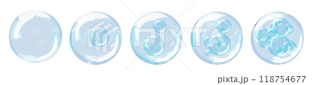 Clear liquid gel cosmetic spheres with bubbles 3d render icon set. Light blue water drops, jelly cream texture, retinol or serum with collagen and hyaluronic acid for beauty skin care. 3D illustration