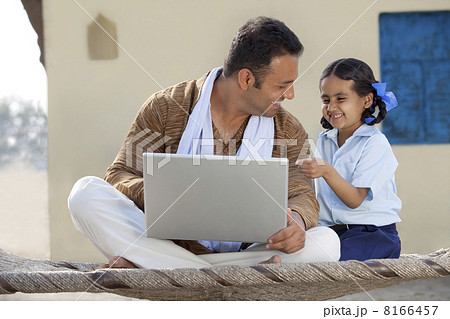 Happy Indian father and daughter using laptop