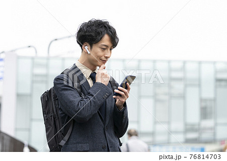 スマホの画面を見るヘッドホンをした30代前半の男性