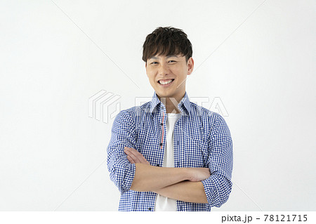 カメラ目線で笑顔の腕組みをするアラフォーの男性