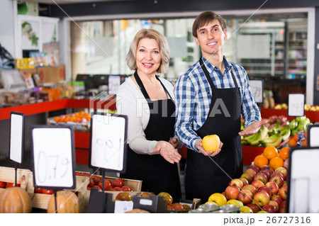 Ordinary fish and seafood store with two cheerful friendly sellers