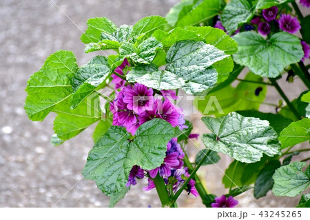 三鷹中原に咲く紫色と白のゼニアオイの花