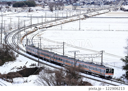 雪景色の東海道線を走る311系電車