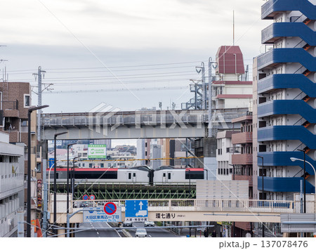 【東京】初春の西新井大師 歩道橋から望む夕焼けと飛行機
