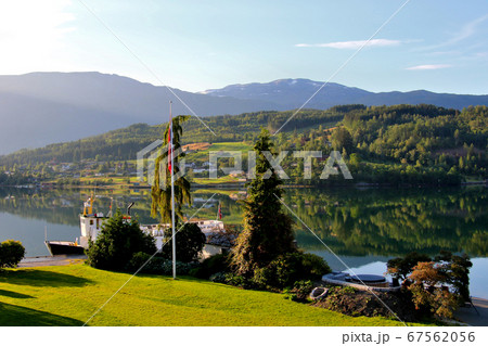 ノルウェー ハダンゲルフィヨルド、ウルヴィク地区に停泊中の遊覧船とノルウェーの国旗 別アングル