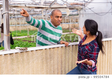 Hispanic male farmer talks to a female colleague, discussing interesting topics.