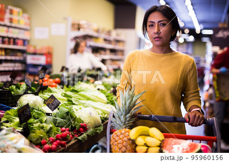 Latin woman choosing ripe tangerines near weighing goods cash register