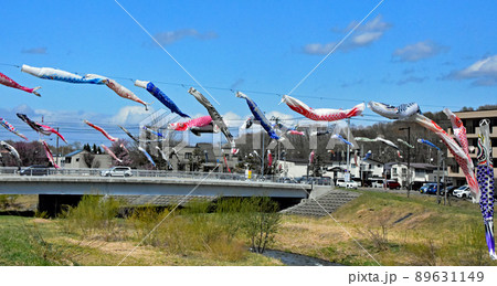 快晴の青空に泳ぐ大きさも色も様々な鯉のぼりです。札幌市厚別川沿いの春の風物詩です。