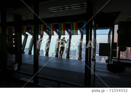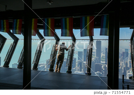 ジョンハンコックセンター展望台からの眺望とチルトを楽しむ観光客 アメリカ