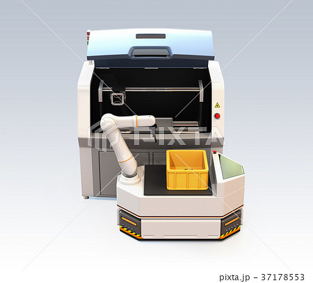 無人搬送車AGVがロボットアームで3Dプリンタから成型済の部品を取り出すグレイシェーディングイメージ