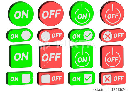 ONの文字が書かれた丸いボタンの3DCGイラスト。赤いスイッチの透過素材