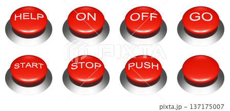 シンプルな赤い押しボタンの3DCGイラスト。英語の文字が書かれた様々な機能のボタン