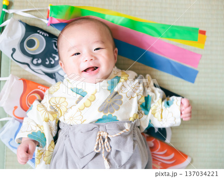 初節句 鯉のぼりと赤ちゃん 端午の節句を祝う男児