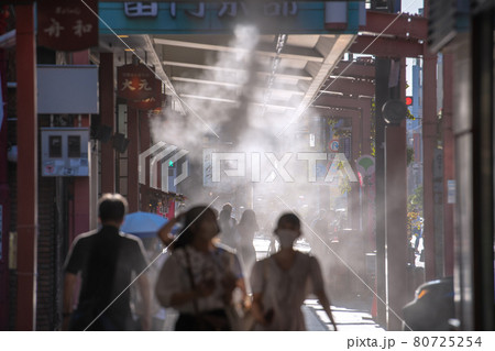 日本の東京都市景観 緊急事態宣言下。浅草寺前の商店街。ミストシャワー が涼をさそう…=8月4日