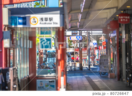 日本の東京都市景観 緊急事態宣言下。浅草寺前の商店街や浅草駅などを望む=8月4日