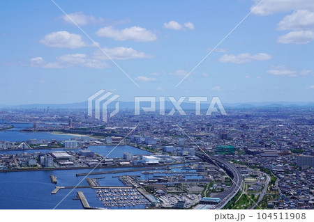 大阪 りんくうゲートタワービルから見た大阪平野と埠頭(貝塚・岸和田・堺等北東方向、初夏)