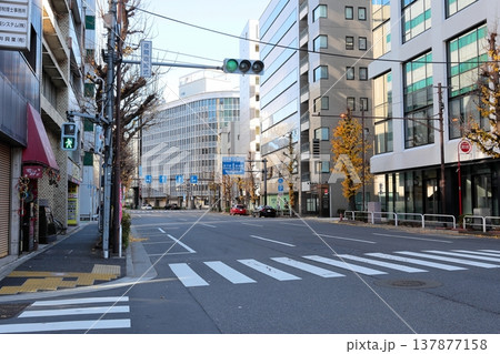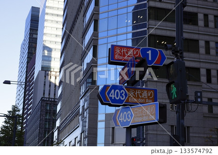 日本の東京都市景観 大手町の交差点からオフィスビル群などを望む