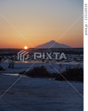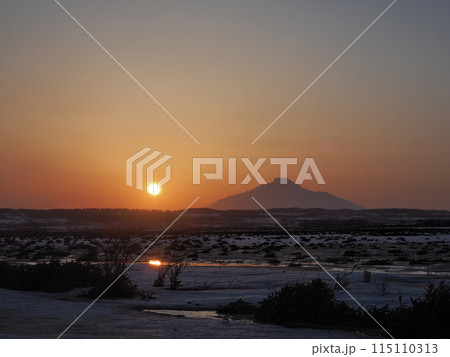 冬のサロベツ原生花園から利尻山の脇に沈む太陽を臨む