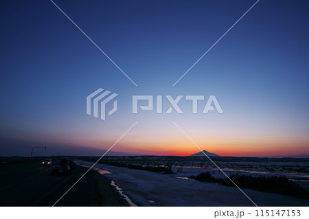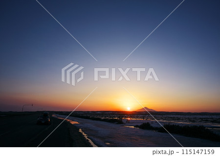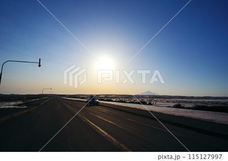 早春の北海道道444号線から利尻山の南に沈む太陽を臨む