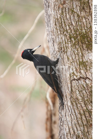 豪快に木を突く日本最大のキツツキ クマゲラ ♂ くまげら 熊啄木鳥 北海道野鳥