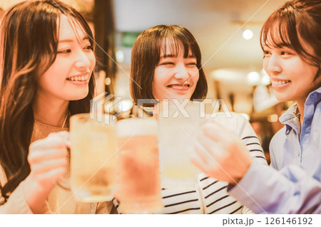 20代の女性たちが居酒屋で乾杯をするシーン