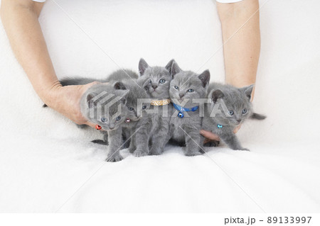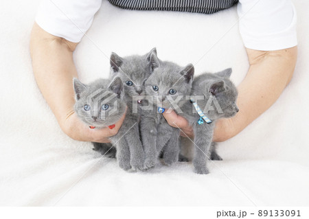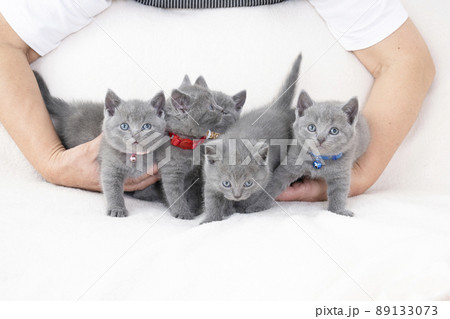 抱えられた5匹のシャルトリューの子猫