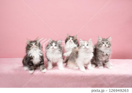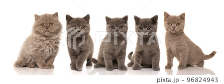 Five pretty british shorthair kittens looking at the camera isolated on a white background