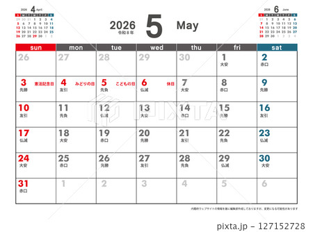 日曜始まり卓上カレンダー令和8年 2026年5月 3ヶ月表示 六曜 シンプルカレンダー素材