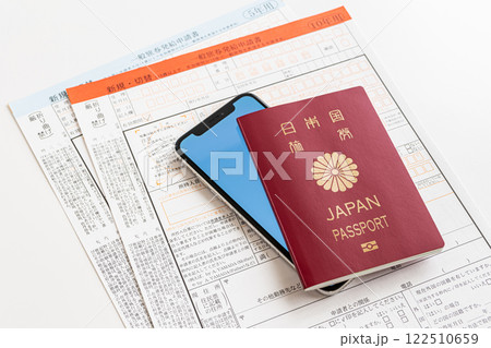 パスポートとスマートフォン パスポートのオンライン申請イメージ写真