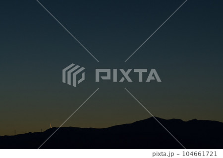 北杜市白州町、夜明けの空に月齢28.5有明の月(位置:左下)