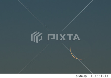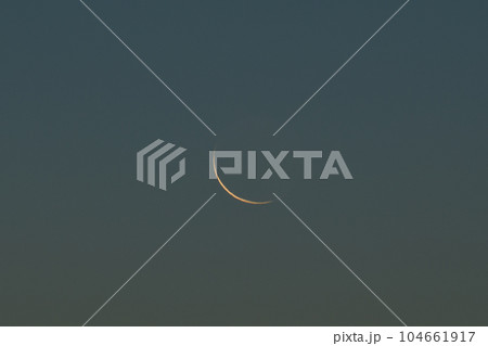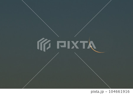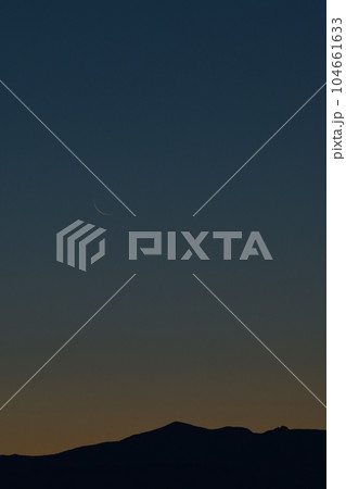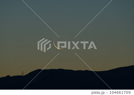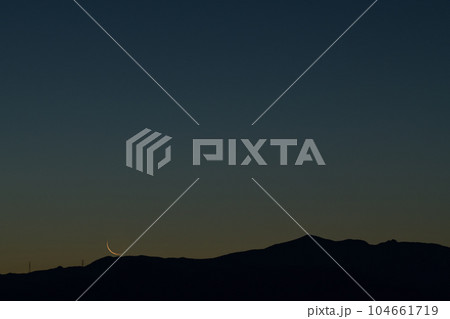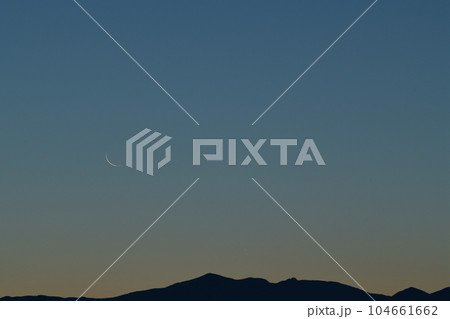 北杜市白州町、夜明けの空に月齢28.5有明の月(位置:左中)